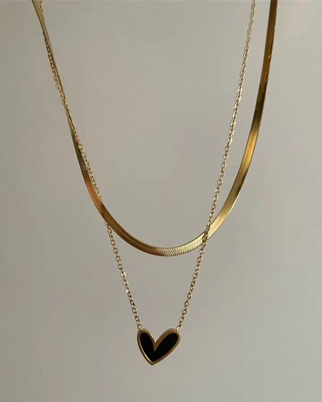 The Double Chain Heart Necklace (Black) features a layered design with a sturdy link chain connected to a heart pendant, complemented by a sleek snake chain. Crafted from high-quality stainless steel, this necklace ensures durability and longevity, making it a reliable accessory for everyday wear.